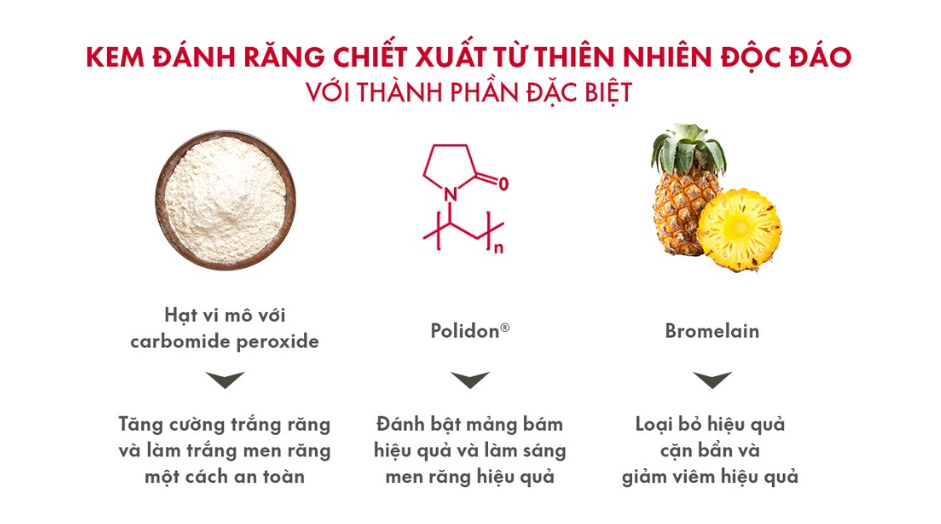 - Kết hợp của các enzyme tự nhiên, các hạt đánh bóng tròn và các hạt carbamide peroxide siêu nhỏ độc đáo tạo ra hiệu quả làm trắng chuyên sâu.