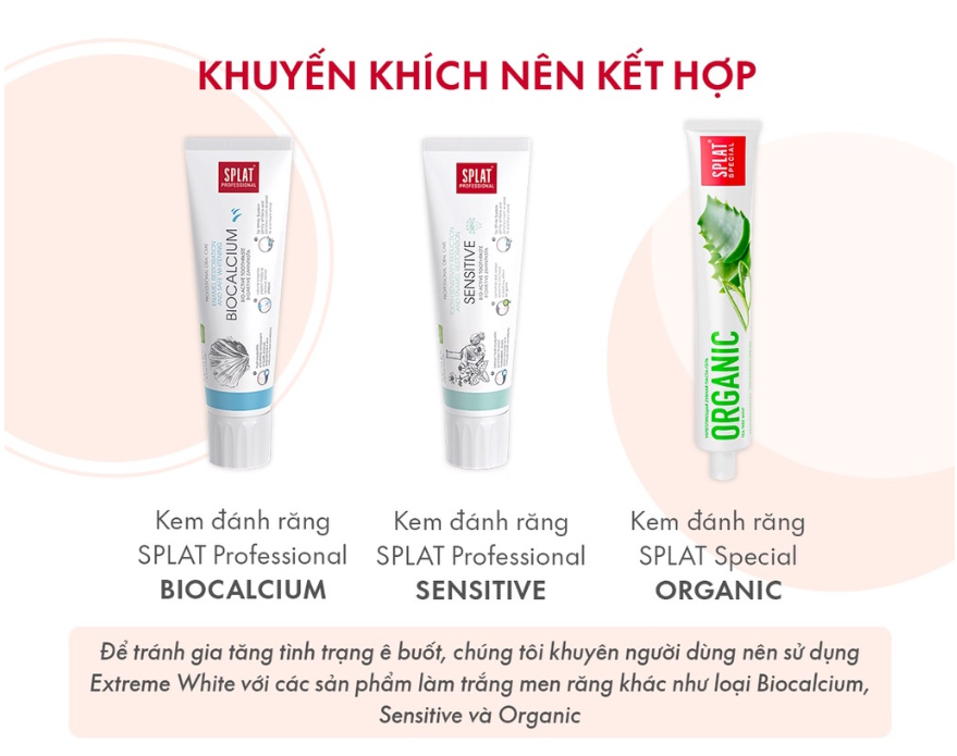 - Tránh tăng độ nhạy, nên luân phiên sử dụng EXTREME WHITE với các loại kem đánh răng tăng cường men răng khác của Splat, chẳng hạn như BIOCALCIUM, sea minerals hoặc organic.